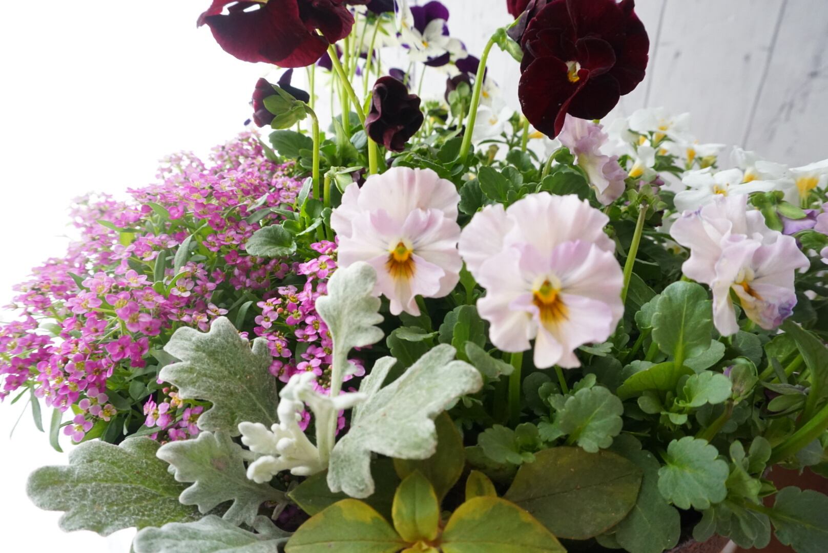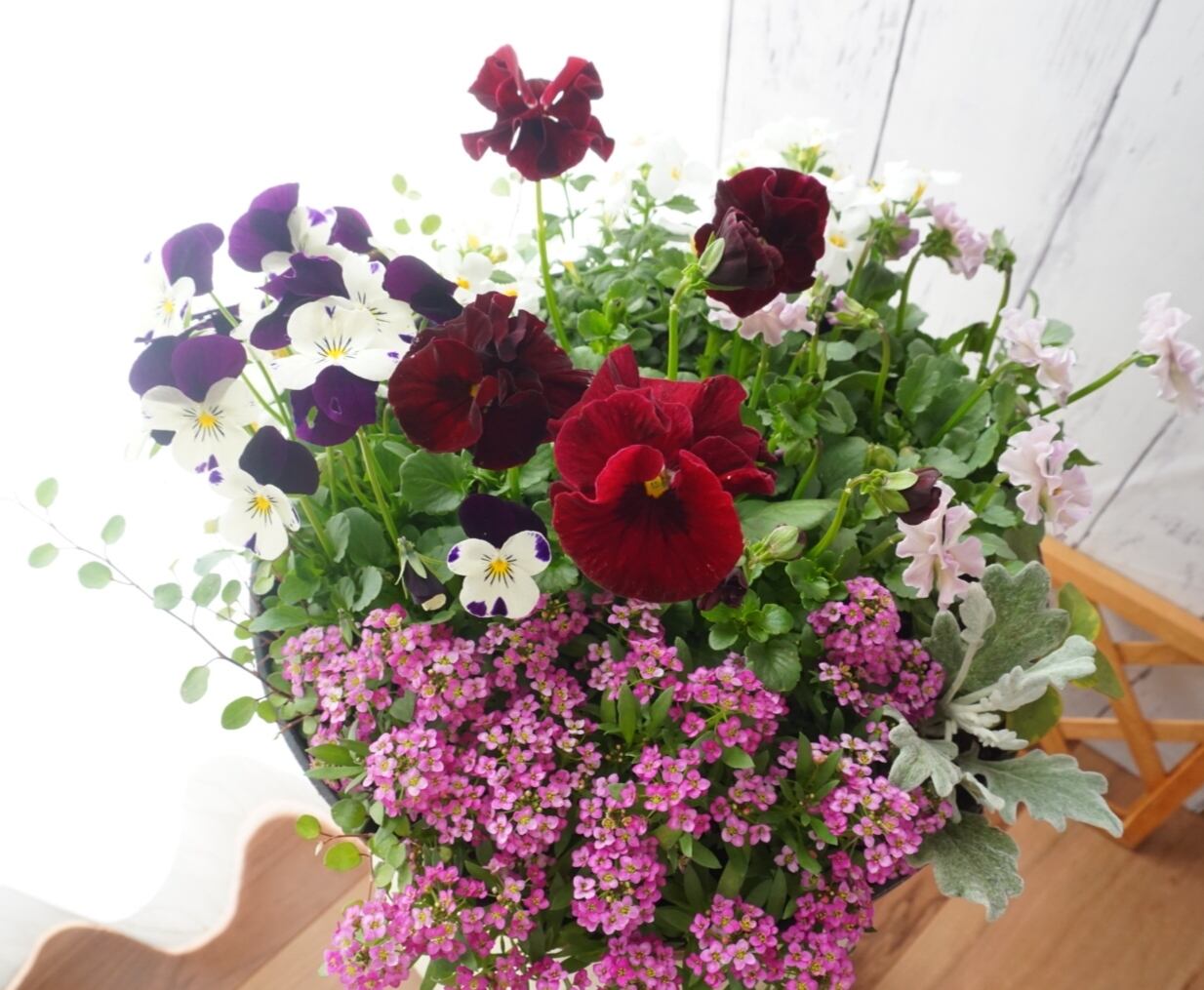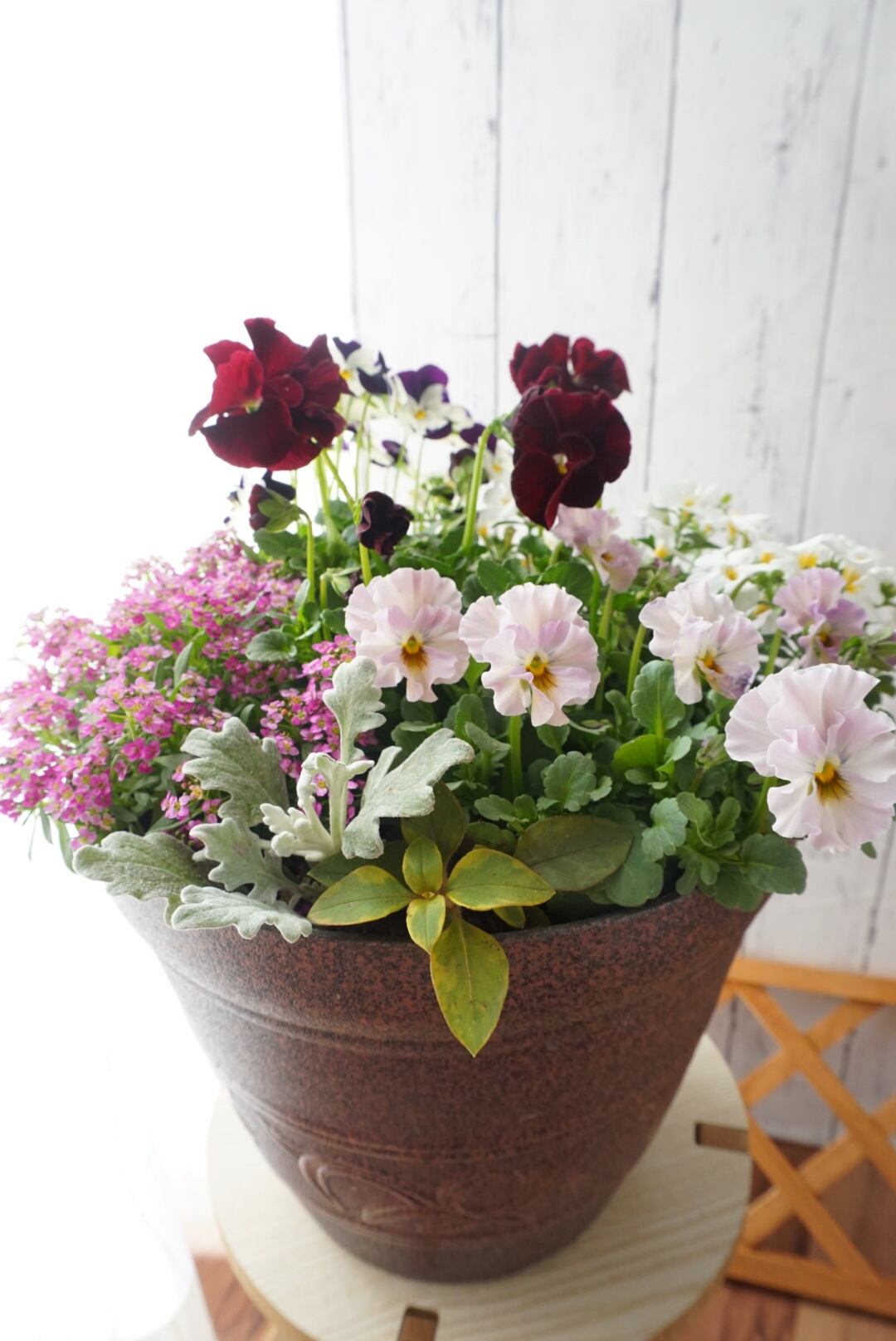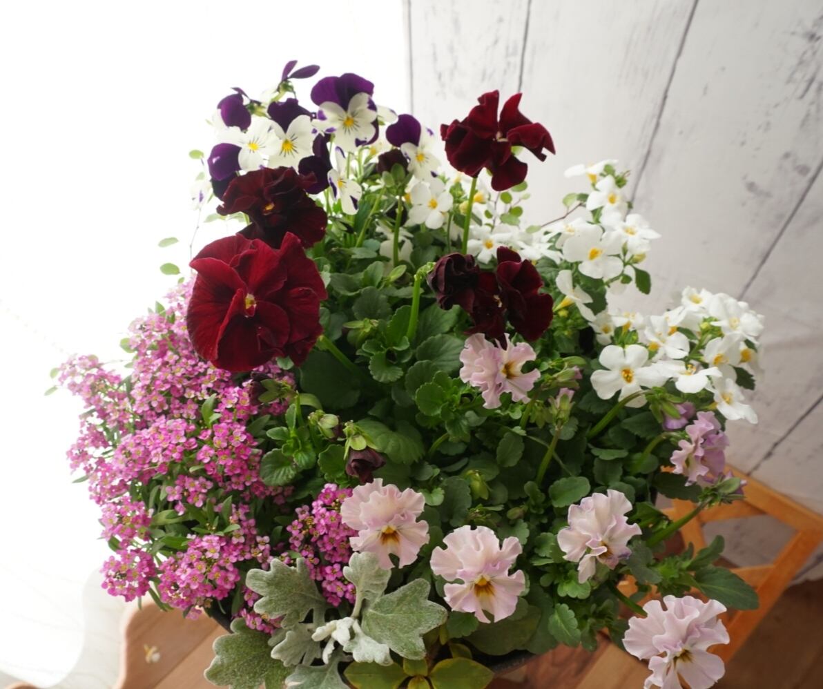 ボルドー色の上品なパンジーとフリルビオラを合わせて、アンティークな雰囲気の寄せ植えを作ってみました。カラーリーフのワイヤープランツで動きをつけました(^^)