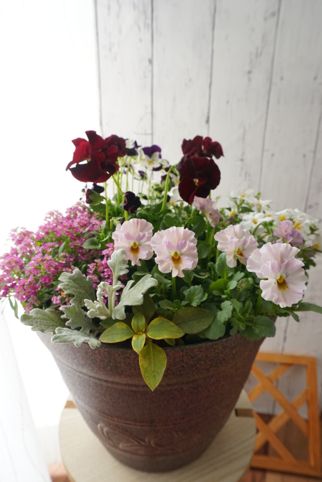 ボルドーカラー&フリルビオラの寄せ植え〜アンティーク鉢〜