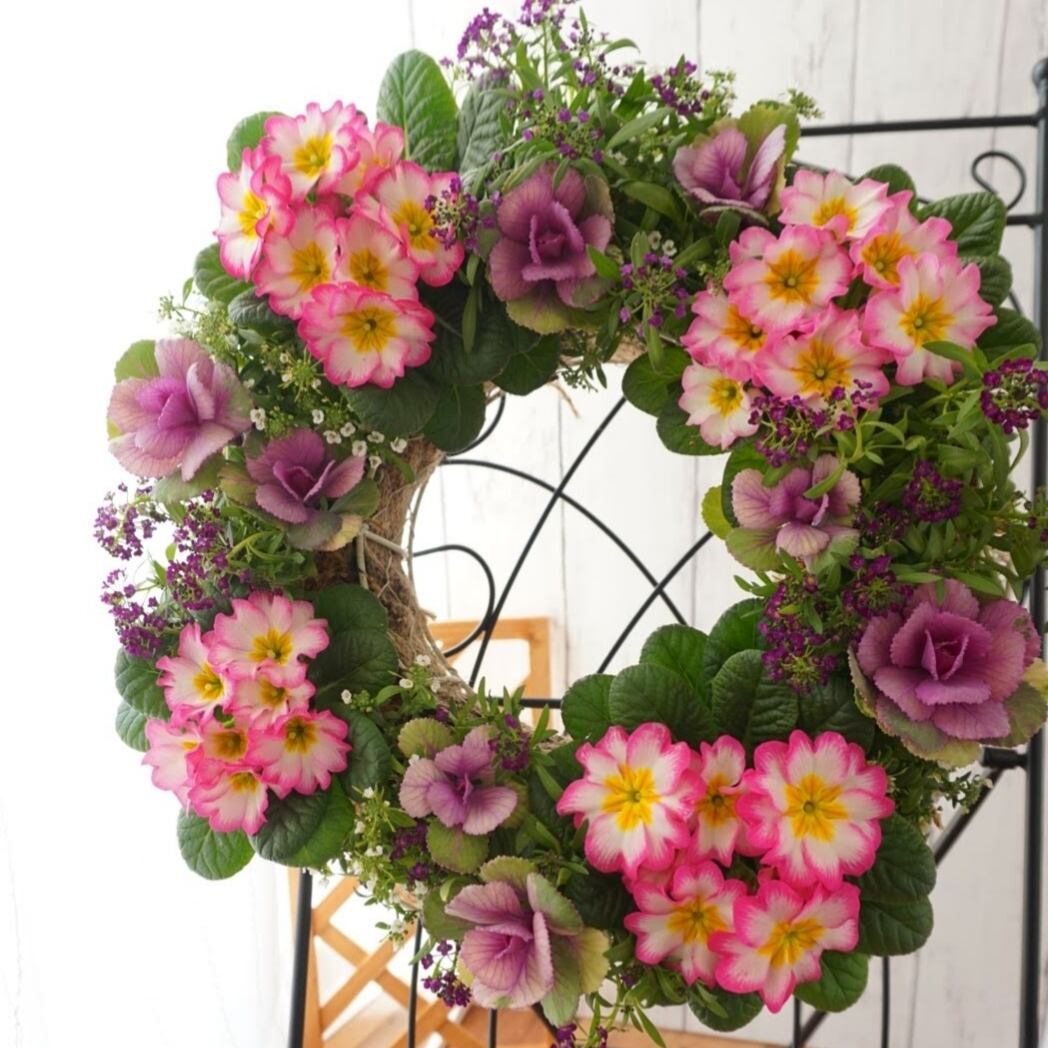 葉牡丹とプリムラジュリアンのハンギングリース