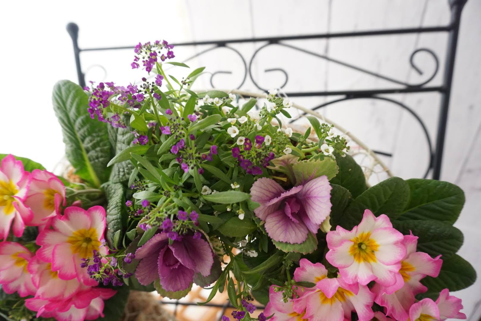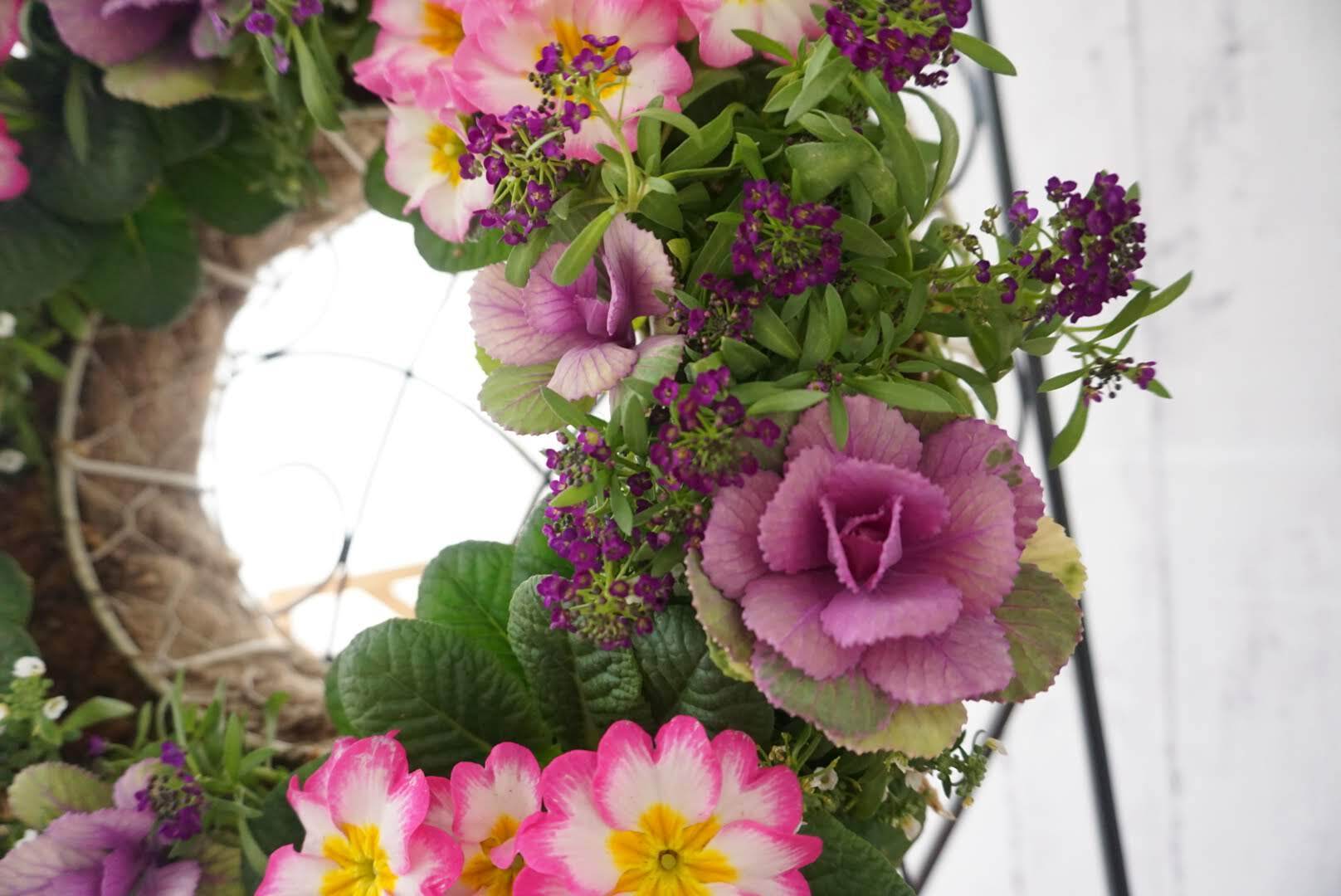 プリムラジュリアンとハボタンのハンギングリースです。間にアリッサムを使用しています。