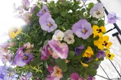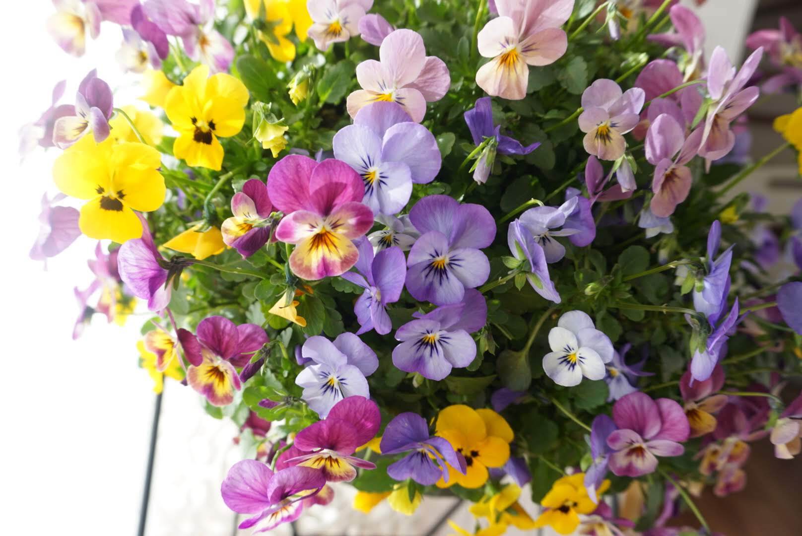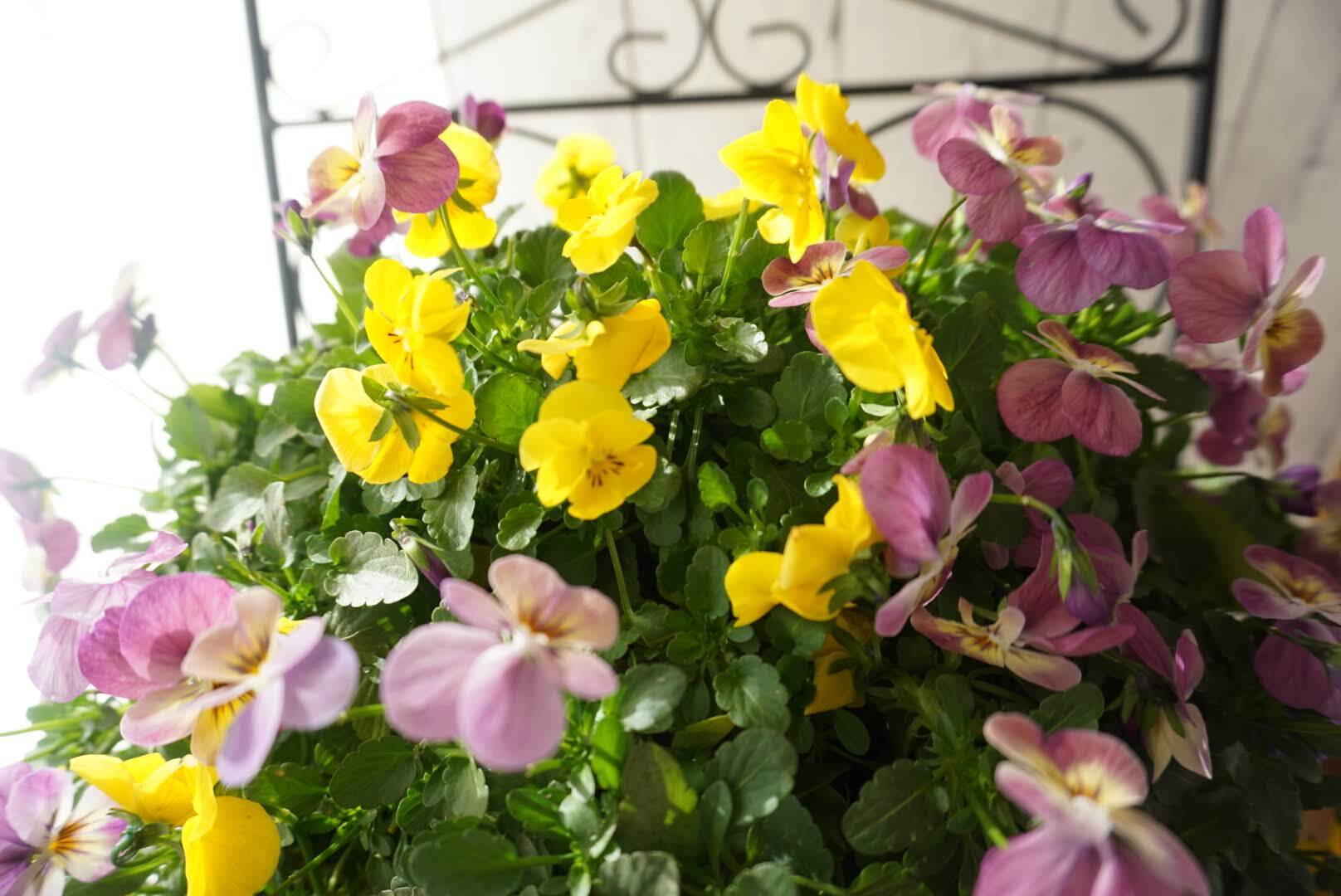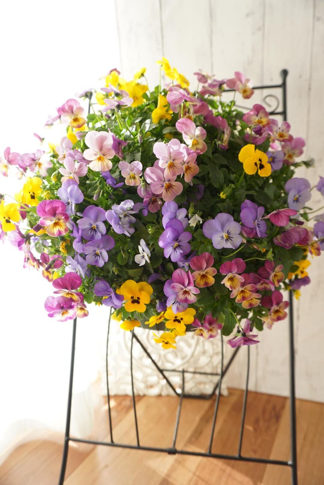 アンティークな雰囲気のビオラハンギングバスケットです。