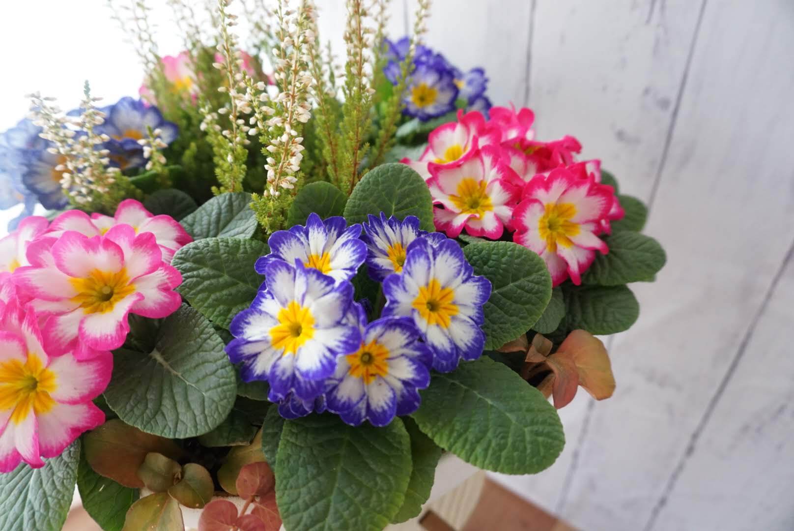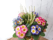 プリムラジュリアンで寄せ植えを作りました。カルーナガーデンガールズを真ん中にして周りにピンクとブルーのバイカラープリムラを合わせました(^^)