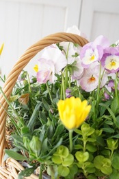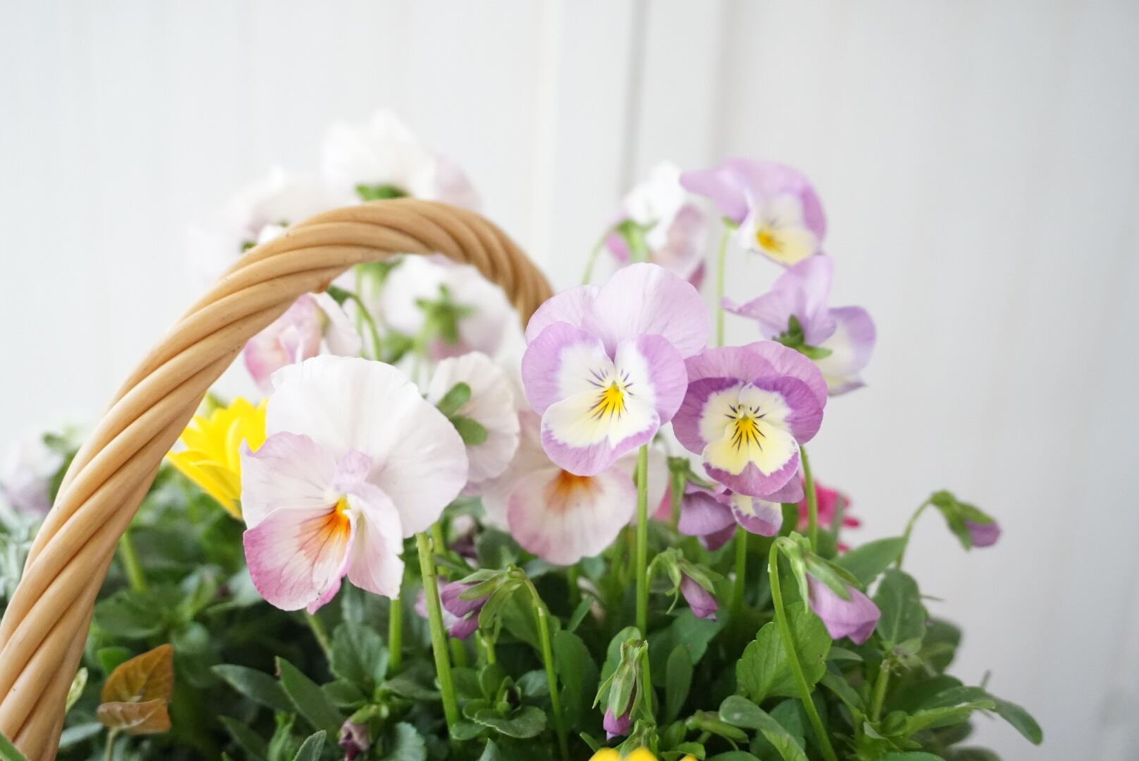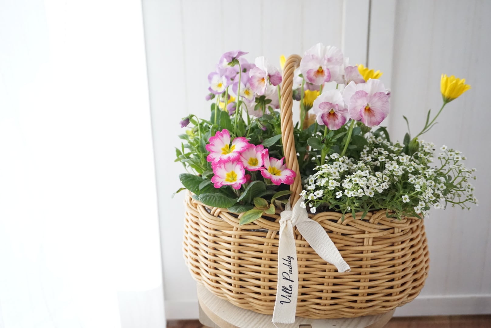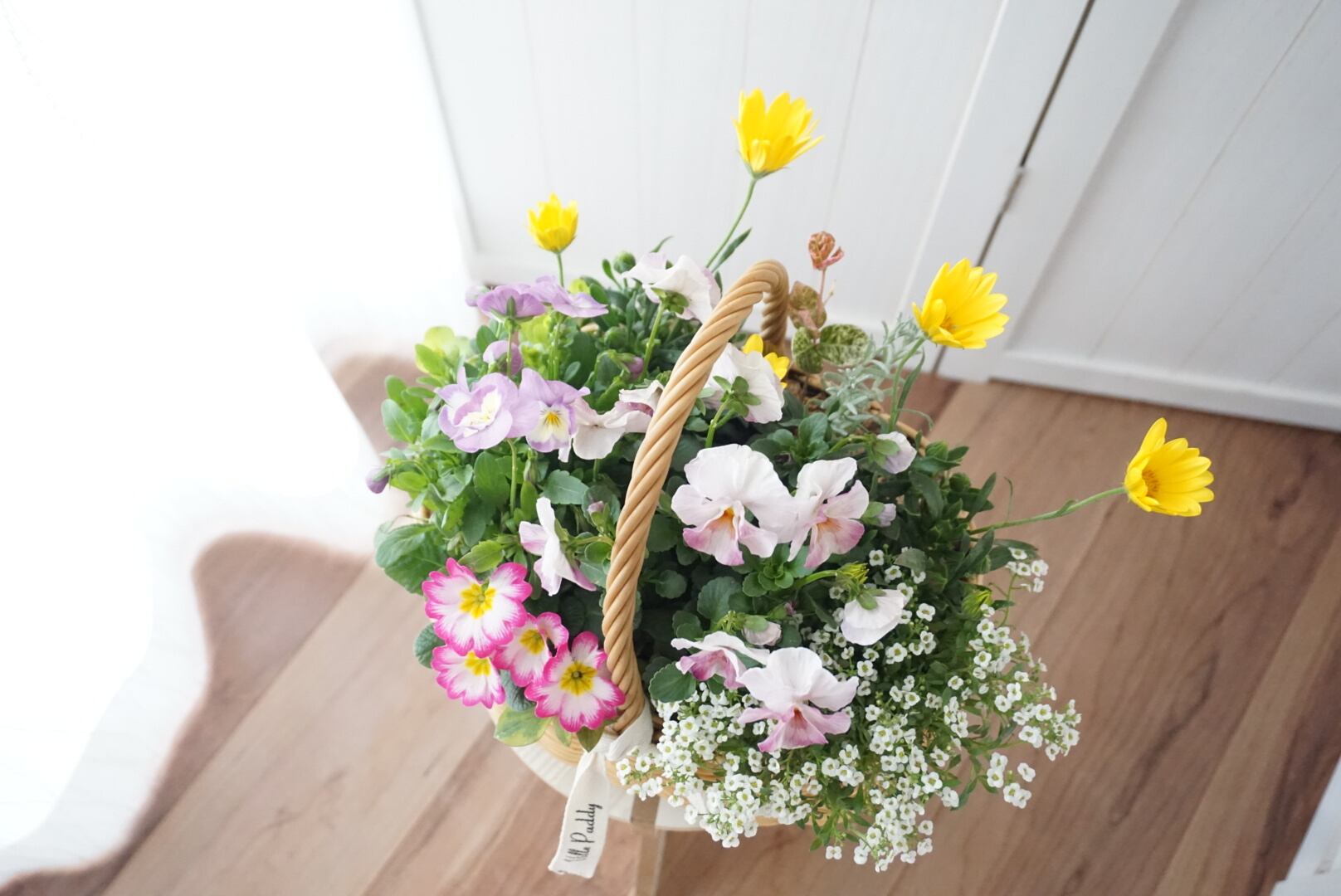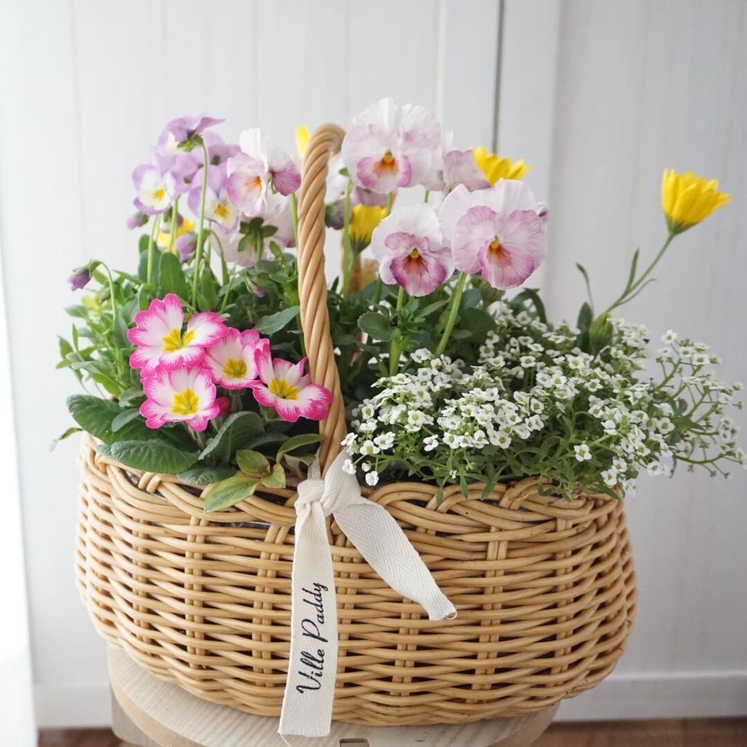 後ろに植えたオステオスペルマムの黄色が加わり、春の彩り満点の花かごバスケットになりました(^^)