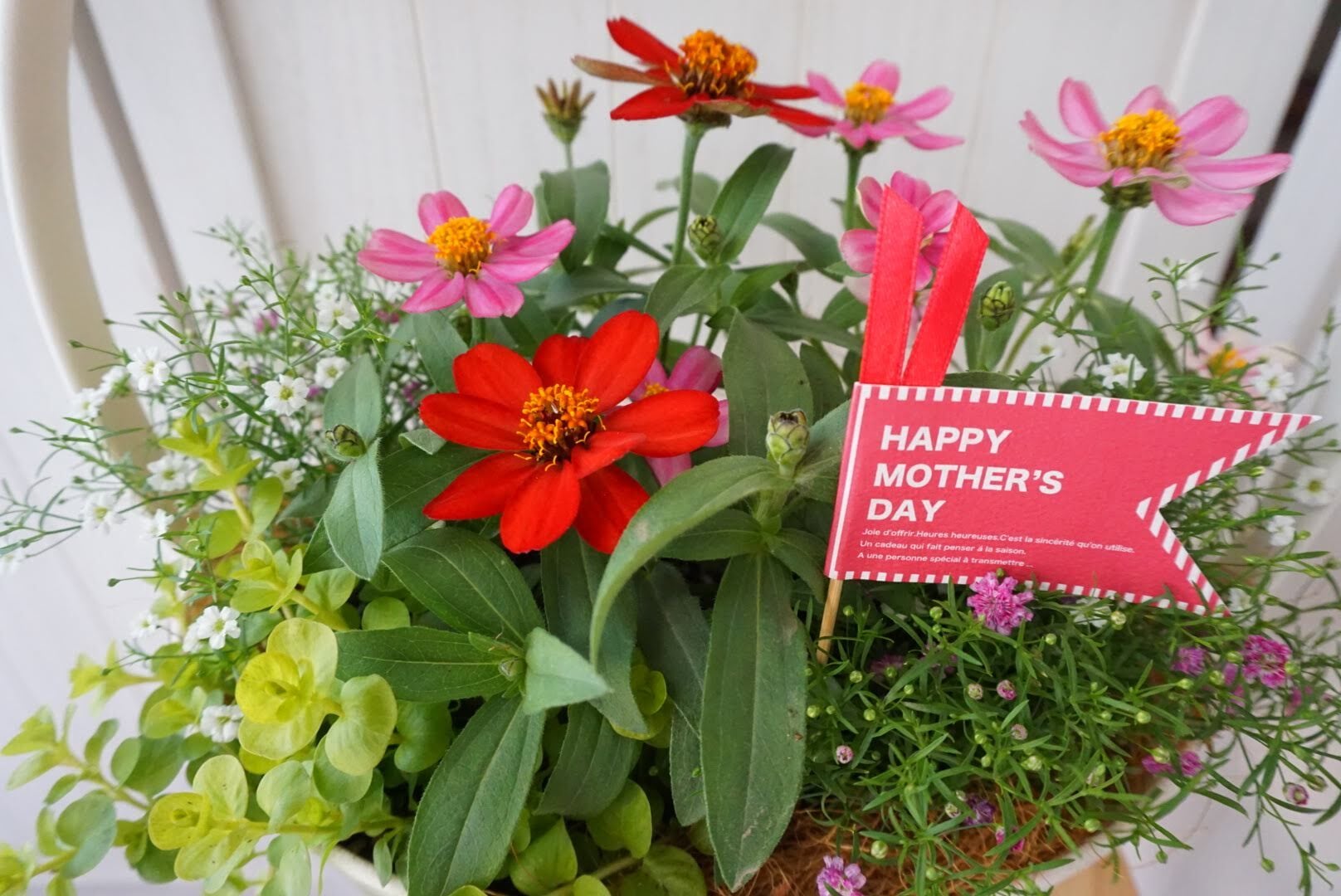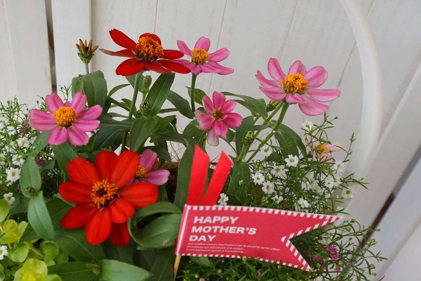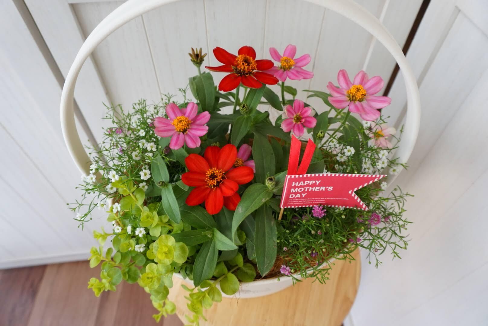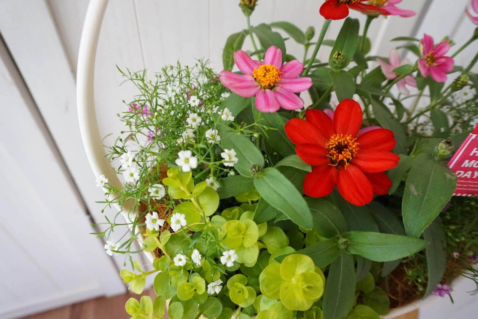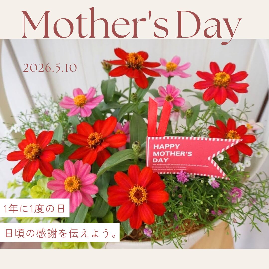 切り花とは違い、根付きの寄せ植えなので、お水をあげてお世話をするたびに愛着が湧いてきます。お花が次々と咲く様子に、お母さんもきっと喜んでくれるはず。