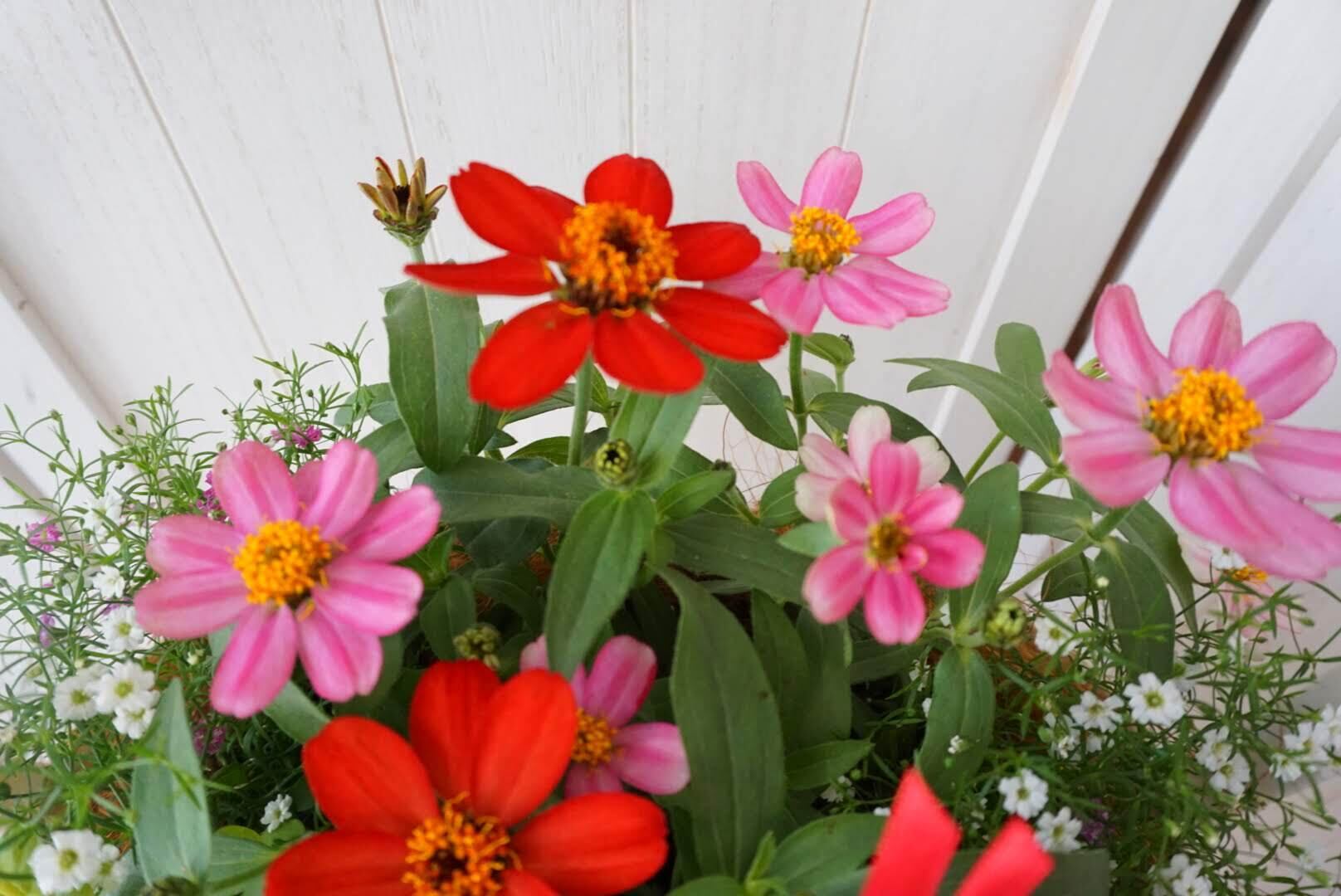 主役のお花は、次々とつぼみをつけて長く咲き続ける「ジニア」。