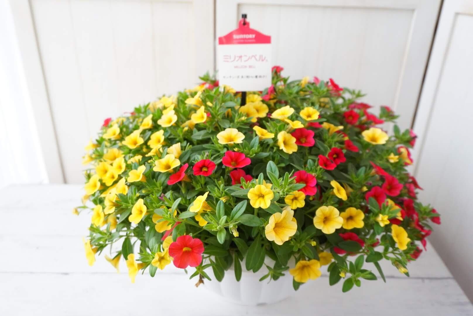 サントリーフラーズのミリオンベル(カリブラコア)10号鉢です。ミリオンベルは花密度バツグン!これから葉っぱが見えなくなるほどお花が咲いてきます(^^)丈夫なので初心者の方でも育てやすいです。