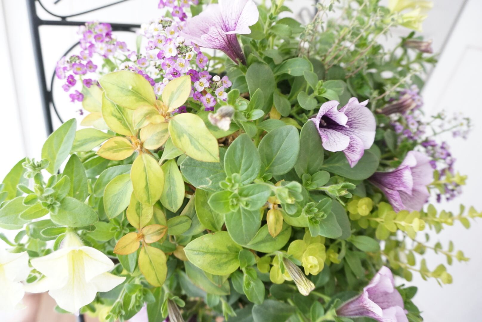 ラベンダーカラーと優しい色味のイエローカラーのペチュニアをメインにしてハンギングバスケットを作りました(^^)