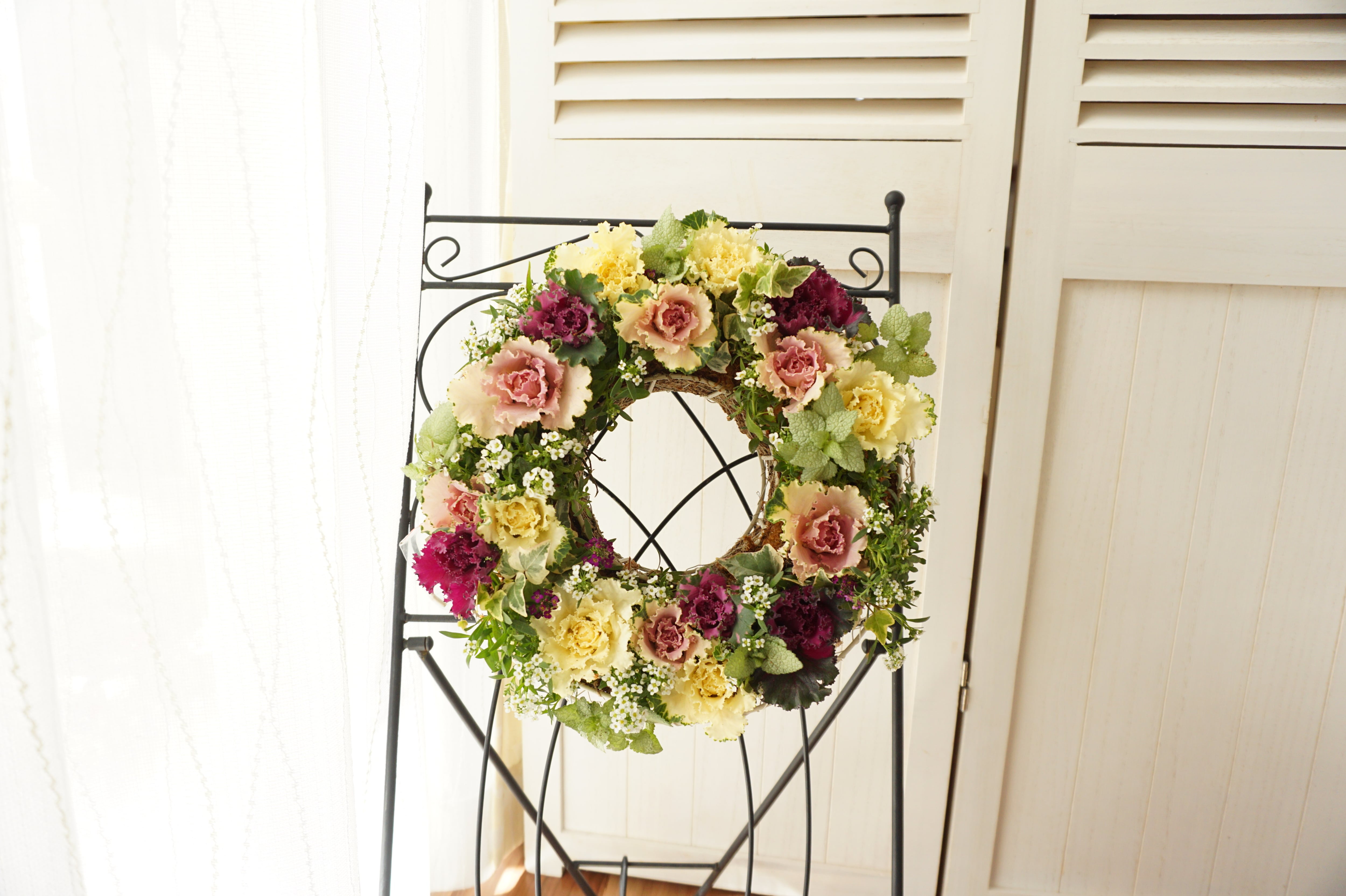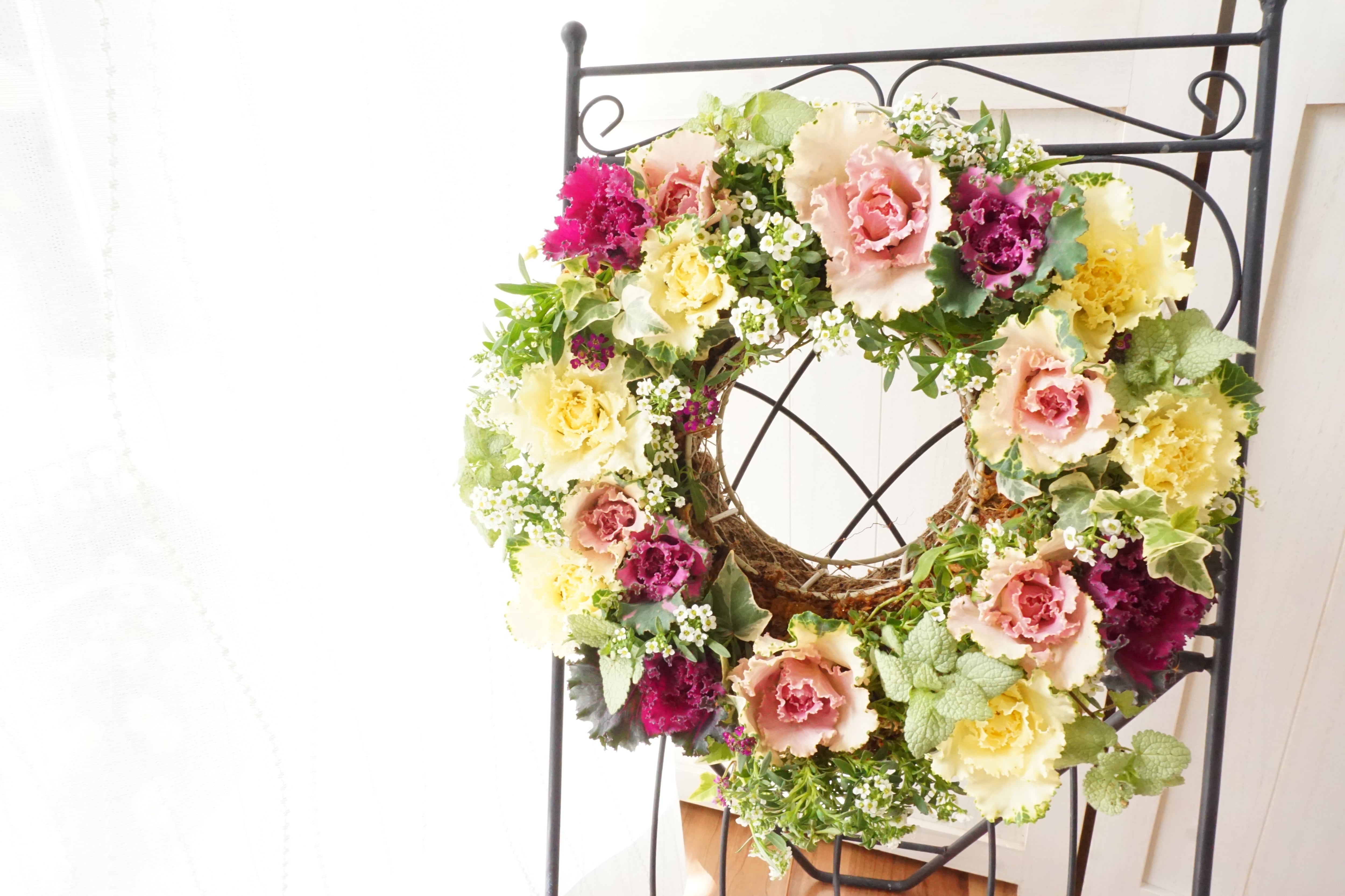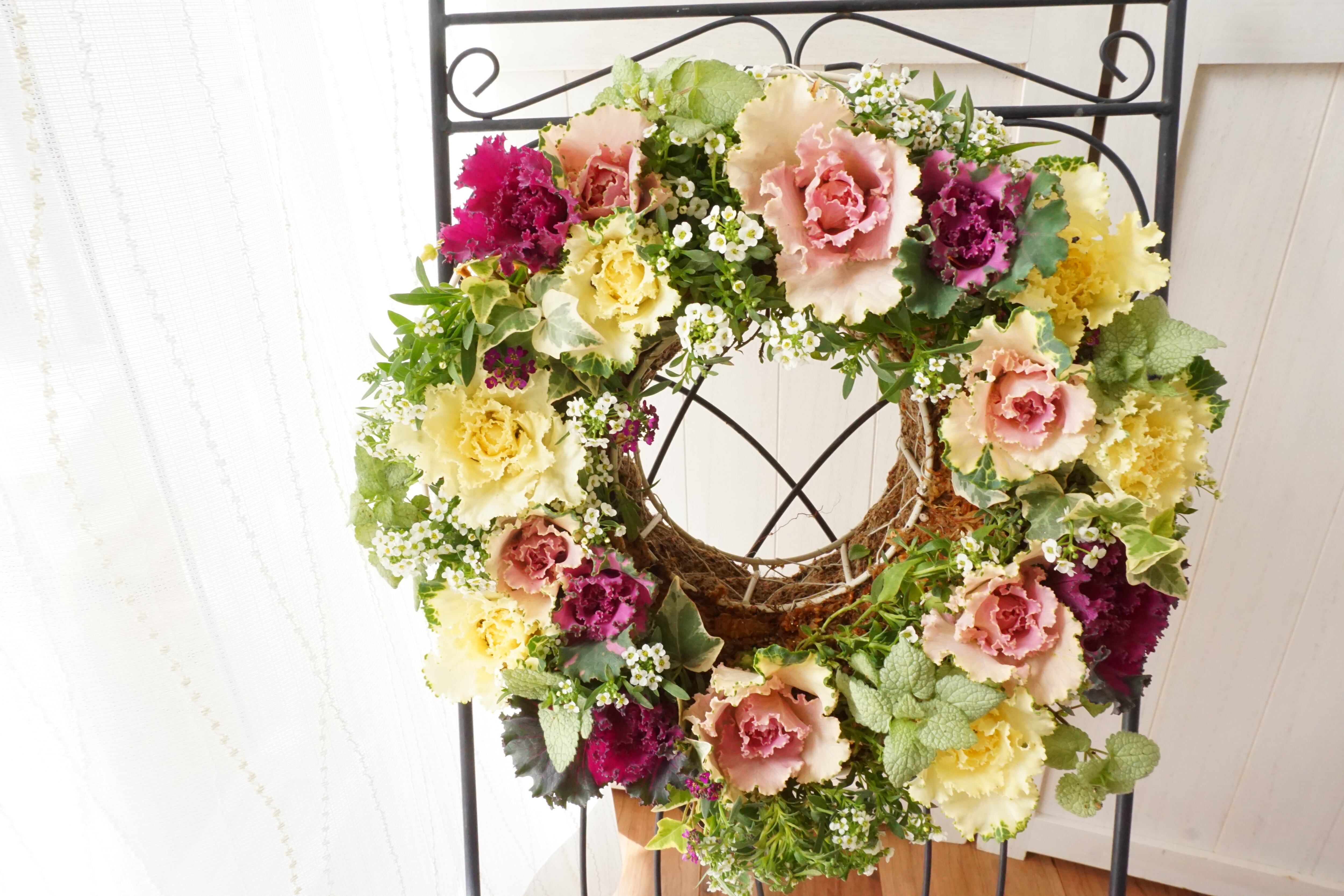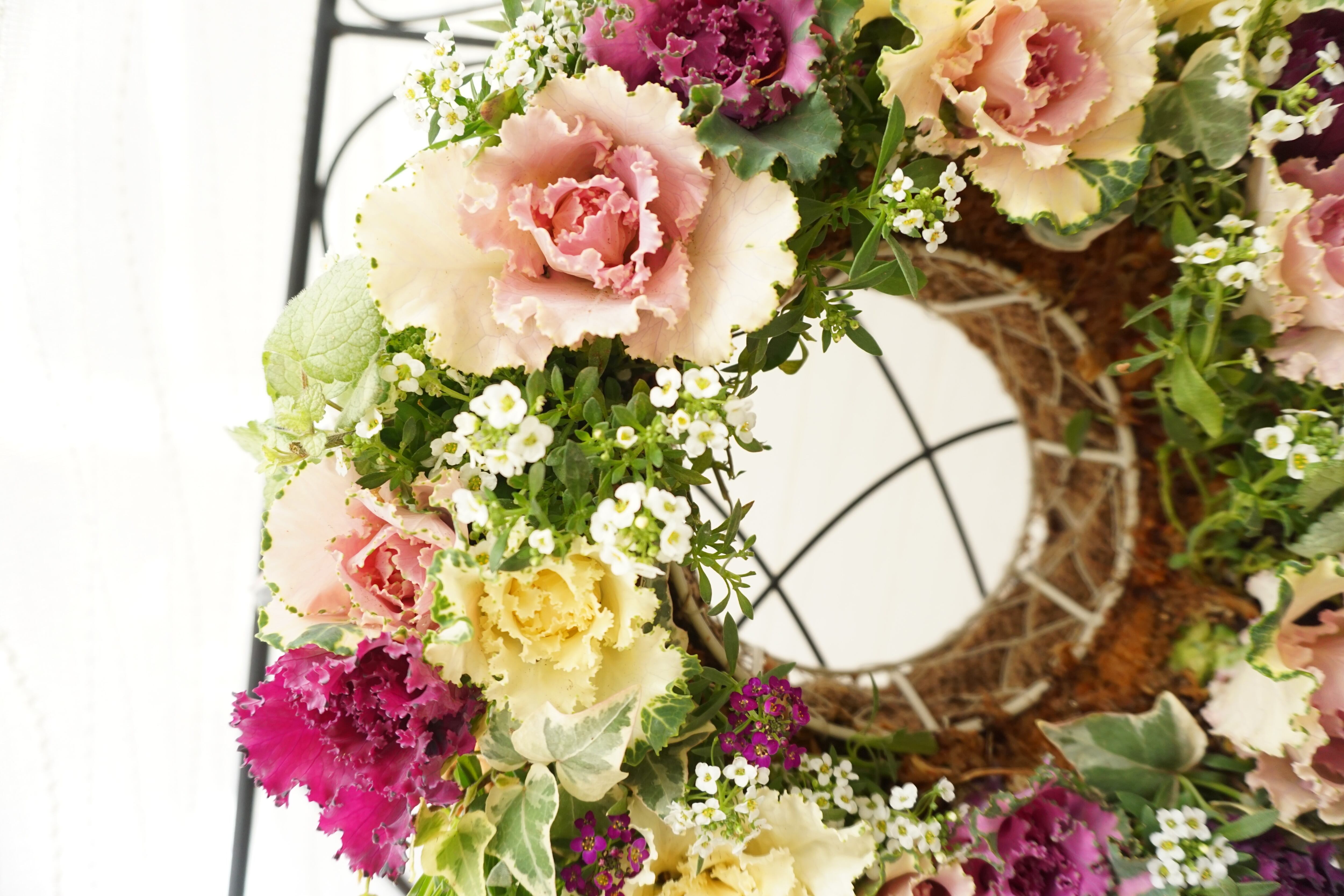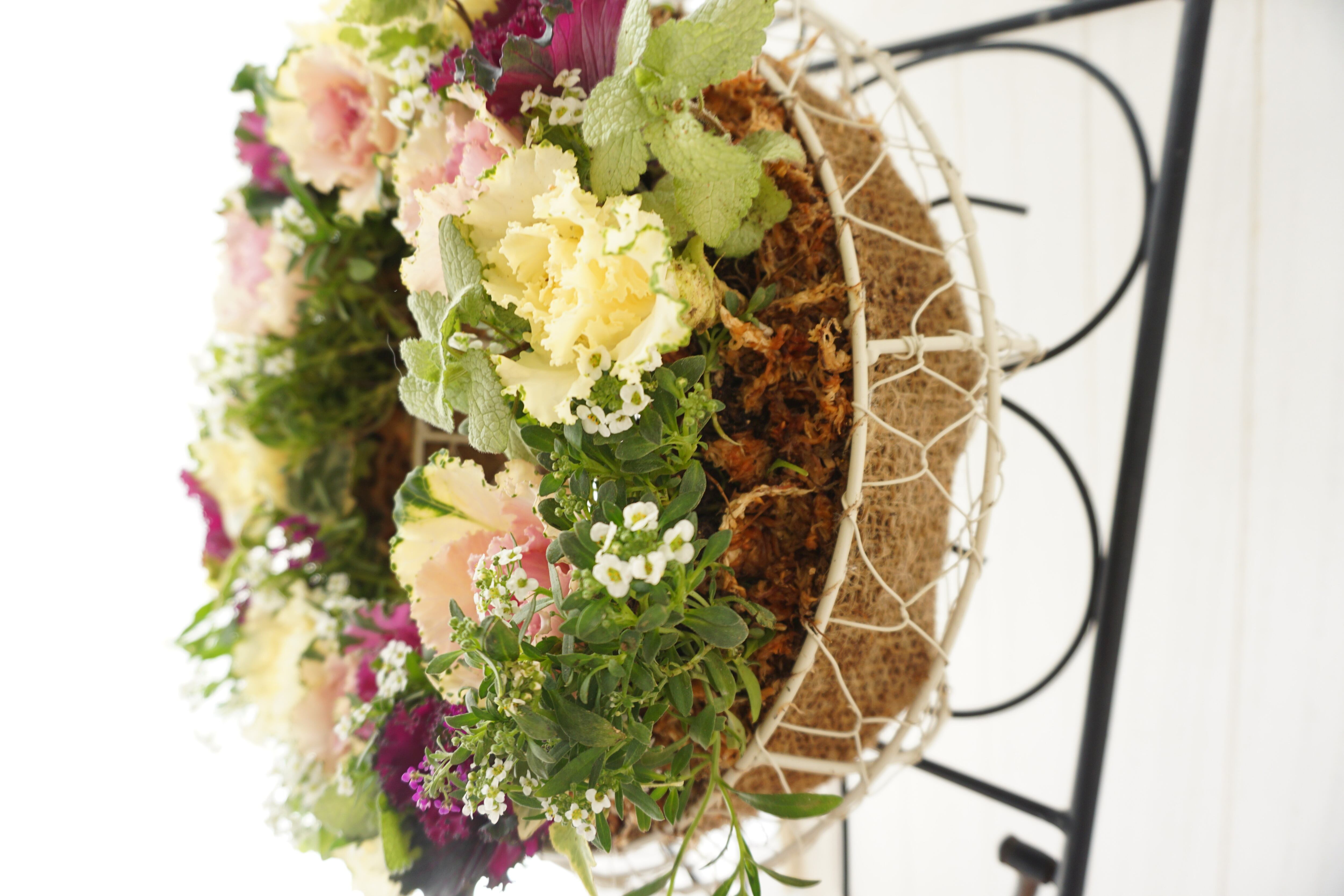 濃いフューシャピンク、シックなパープル、そして明るいクリームイエローのハボタンが織りなす華やかな彩りに、雪のような純白のアリッサムが優しい香りと可憐な表情を織りなしています♡