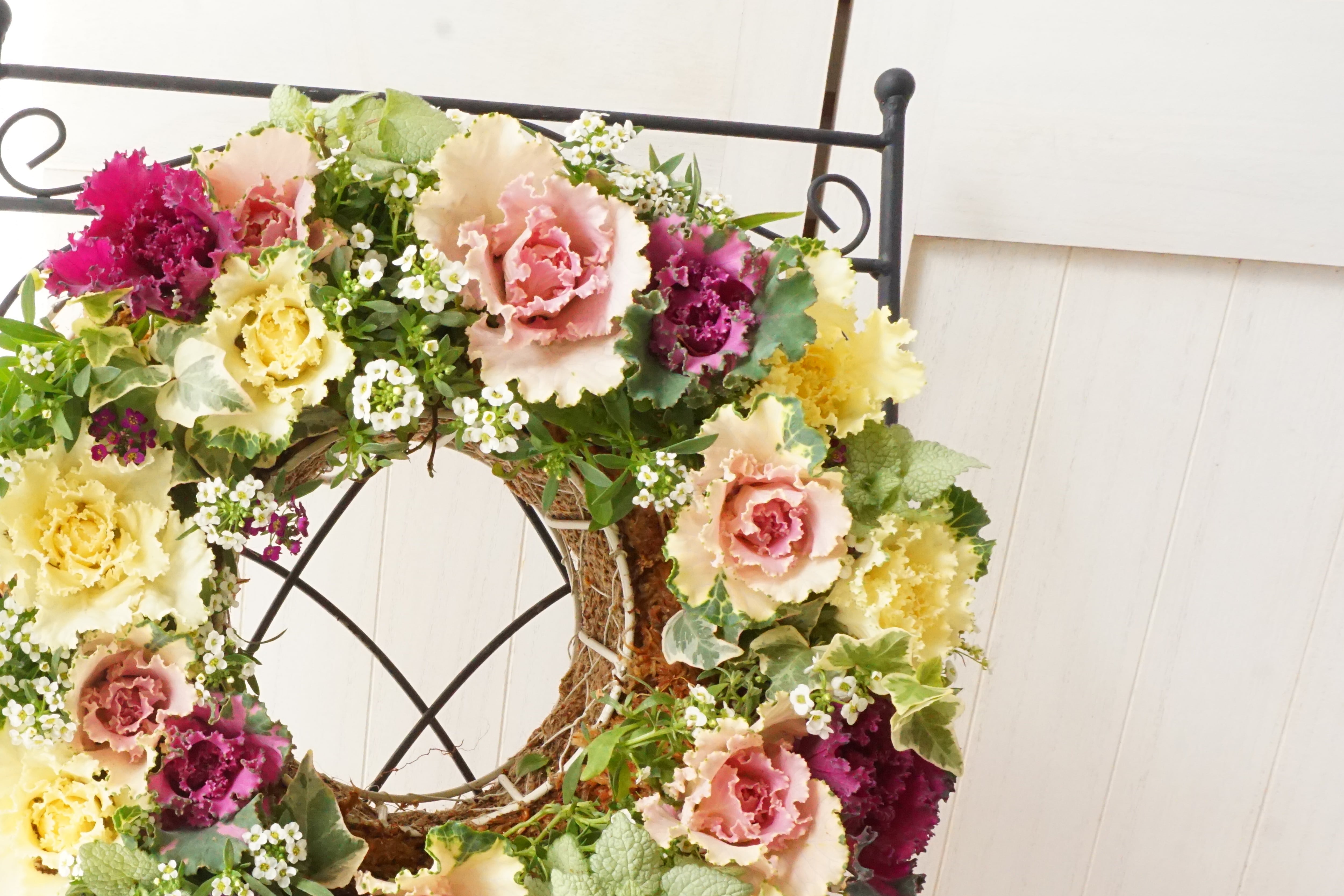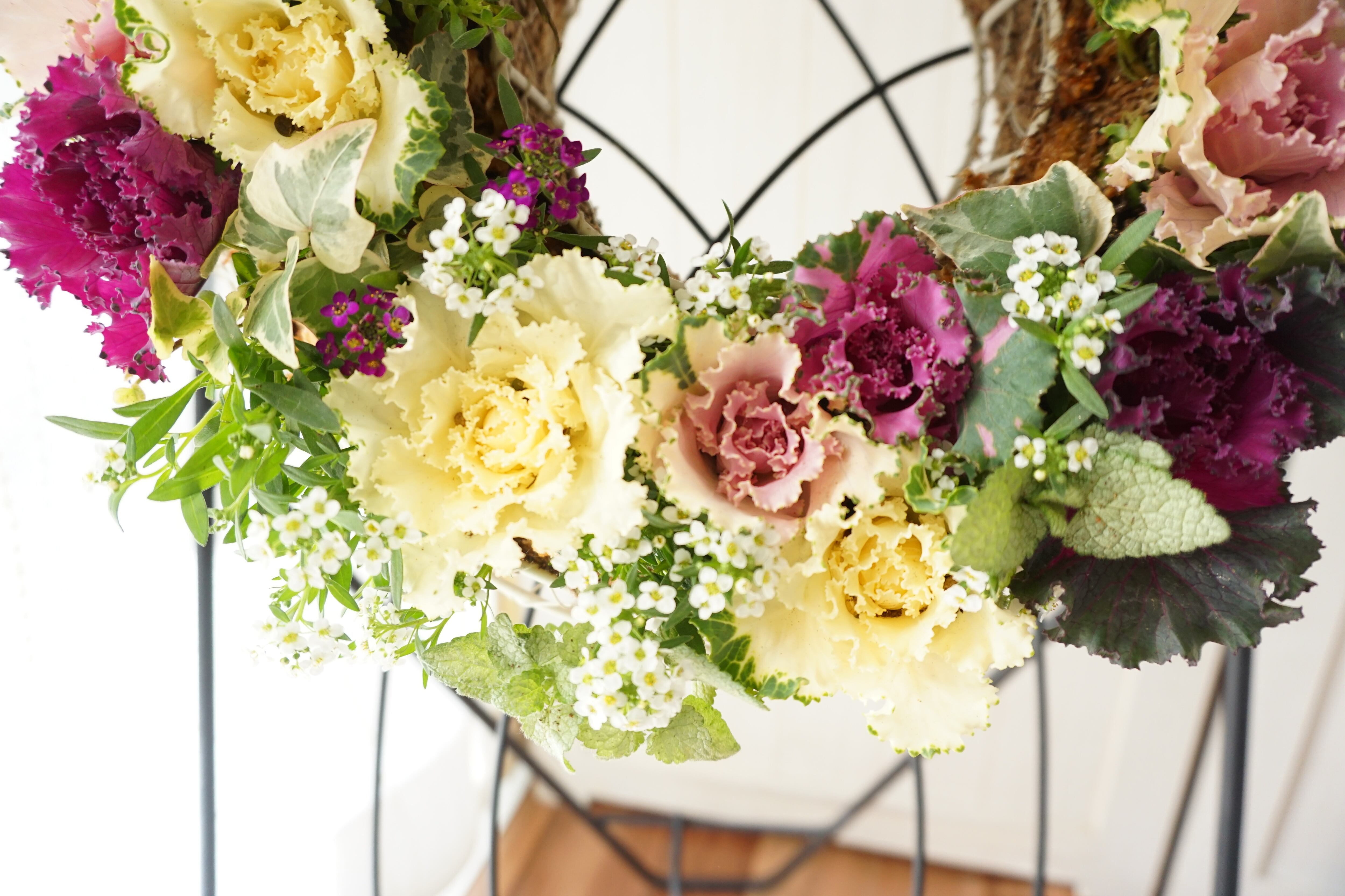 豊かなフリルとグラデーションが美しいハボタンを、豪華なキャベッジローズ(バラ)のように贅沢にあしらいました♪