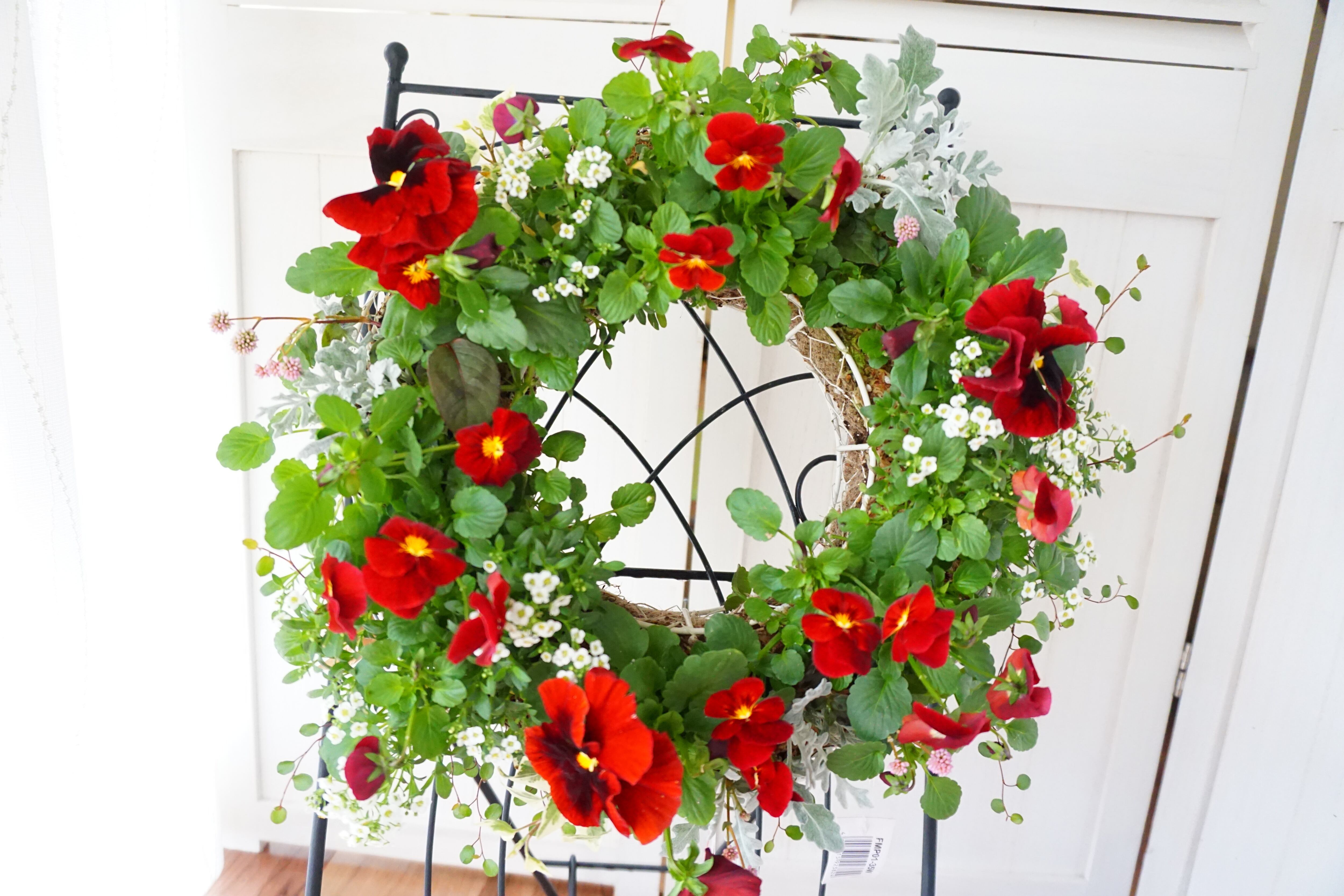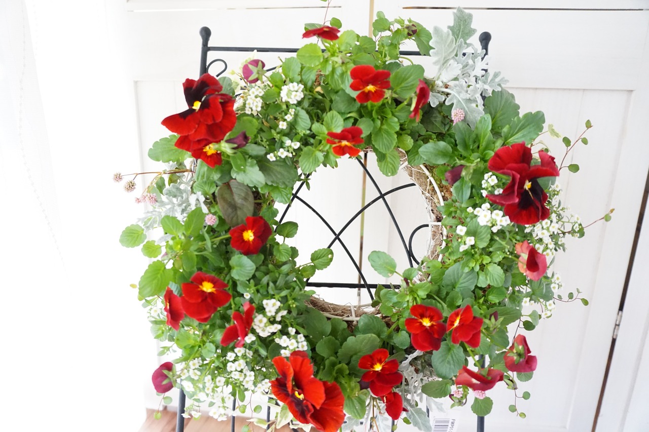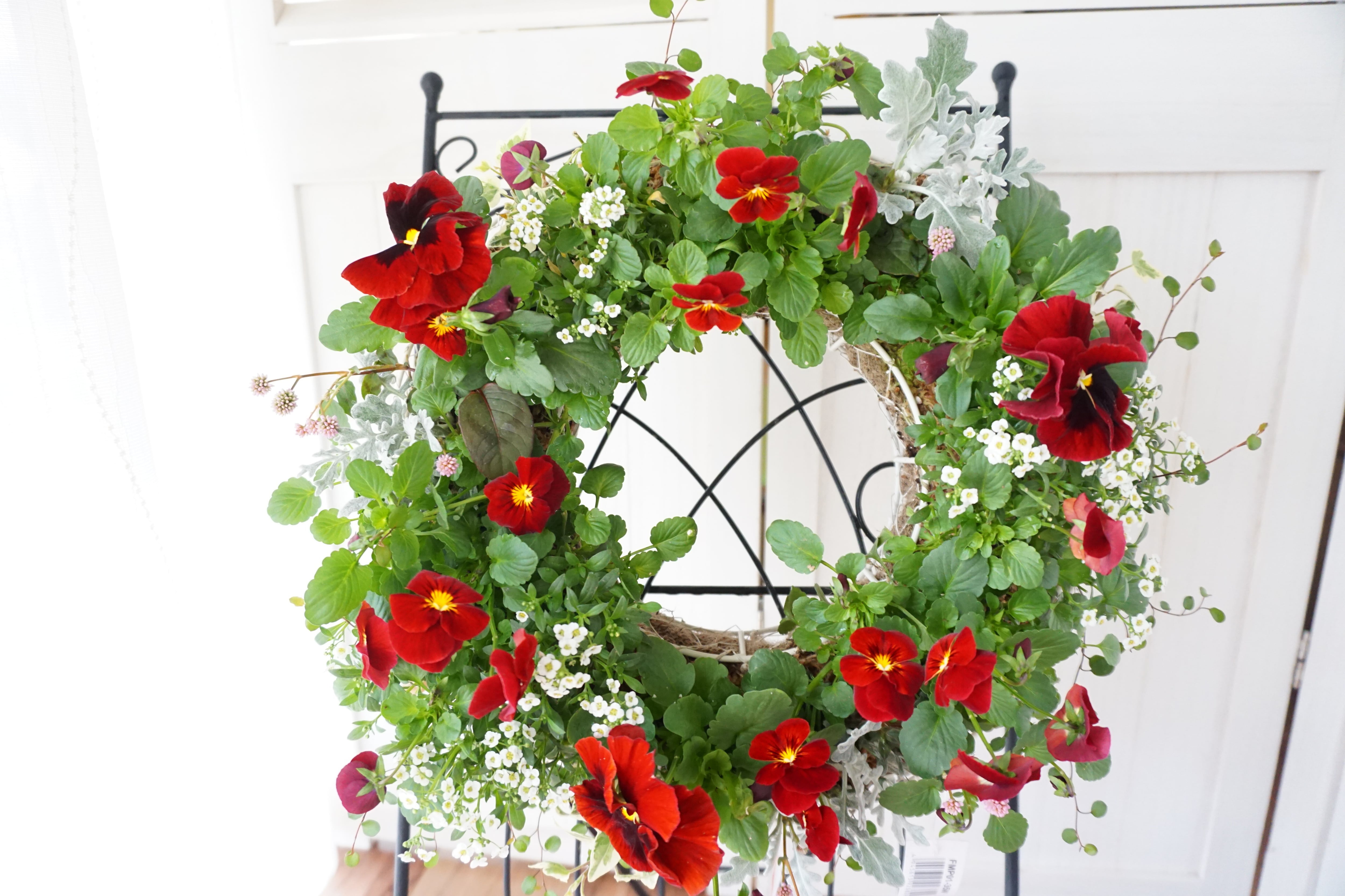 赤系ビオラ・パンジーとカラーリーフのクリスマスハンギングリースです♡