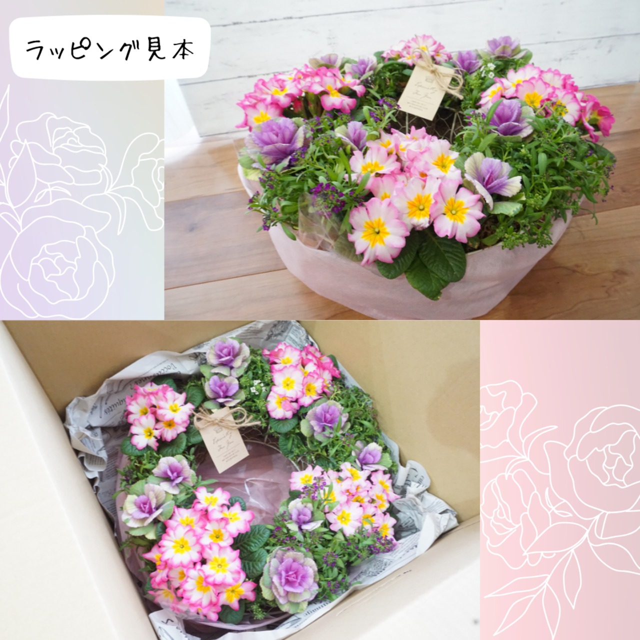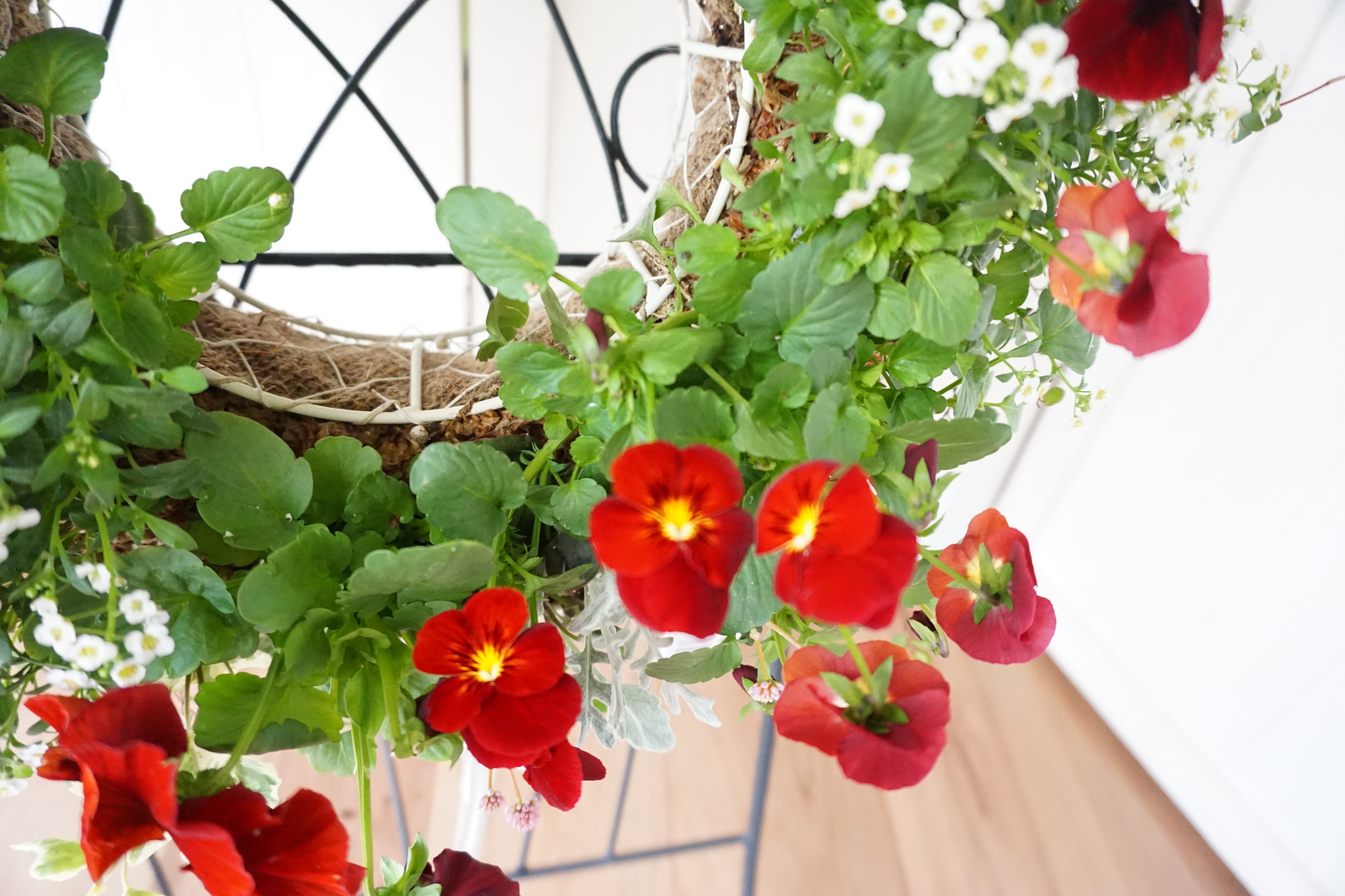 こちらは生花のハンギングリースになります。根付きの花苗を使用しておりますので、長い間お花を楽しんで頂くことができます(^^)